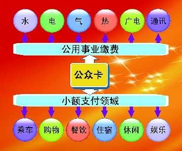 水、电、气、热等公用事业缴费,以及购物、乘车、餐饮等领域的付费将一卡搞定