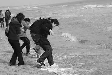 12月2日中午,几位游客在万平口海边戏水。当日最高气温14℃,不少人趁天暖出来游玩。