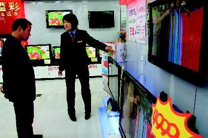 12月1日,在市区一家电商场,市民在选购平板电视产品。据悉,从12月1日起,平板电视将实行能效等级制度,能效比不达标的电视将全面退市,这是继洗衣机、冰箱、电磁炉、电饭煲、电风扇、空调后,又一产品实施能效准入制度。