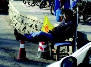 时间:2009年12月5日;地点:济南市;自述:交通路锥“兼职”撑着腿也能睡,睡得真是技术。