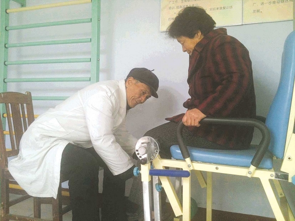 2日,泰前街道办事处王家庄社区卫生服务站康复室,医生刘家兴正在为社区残疾人叶秀芝做康复训练。在世界残疾人日到来之际,王家庄社区举办关爱残疾人活动,免费为社区残疾人义诊、体检、做康复训练。