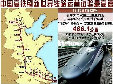 今年9月28日,沪杭高铁试运行创下时速416.6公里的世界纪录。此次京沪高铁测出486.1公里的时速,几乎相当于喷气式飞机低速巡航的速度,再次演绎了“中国高铁奇迹”。