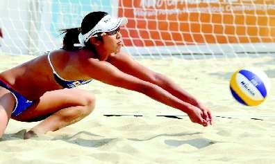 12月3日,日本队球员沟江明香在比赛中救球。当日,亚洲女子沙滩排球邀请赛在中国香港元朗拉开帷