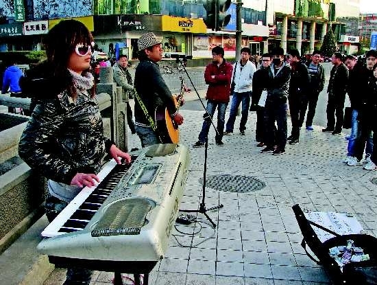 12月3日,济南南门,一支“青春乐队”正激情演唱,娴熟的演奏和颇具专业水准的歌声,与一般的街头乞讨者明显不同,许多听者向琴盒里投入钱币表示支持。近年来,大都市经常出现的街头艺人在济南也渐渐多了起来。本报记者周青先 摄