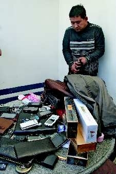 12月3日上午,在历下分局刑警二中队,市民唐杰(化名)正在一堆警方查获的被偷物品中寻找自己的手提包。唐杰说:“民警打电话说小偷抓住了,让我来认领丢失的物品。”