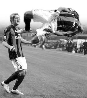 北京时间12月5日凌晨3点45分,意甲联赛第15轮拉开战幕,AC米兰本轮坐镇主场迎来布雷西亚的挑战。比赛刚开始伊布就助攻博阿滕先拔头筹,然后罗比尼奥以及伊布各入一球,最终米兰3∶0战胜布雷西亚。图为博阿滕空翻庆祝进球。