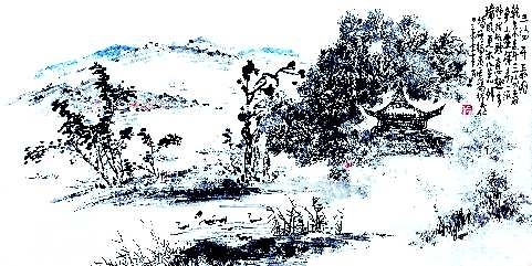展卷再看时,只见亭子、树木、水草、鸭子等元素有机融合,远山一抹,画面清新疏朗,生机勃勃,不着颜色而墨色益美,不着人物则意境更幽,无墨处尽是流动的云水,灵气满纸。三位画家对大自然的深刻理解与强有力的笔墨驾驭能力让人感叹。
