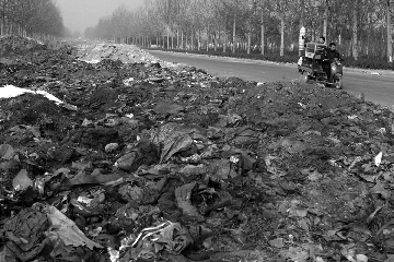 5日,在潍坊市老青年路上,成片的垃圾绵延700多米。由于青年路截弯取直,改造后老的路段已经停用,因此很多车辆将建筑垃圾倾倒在路上。大片的垃圾占去了一半的路面,让老青年路变成了垃圾场。