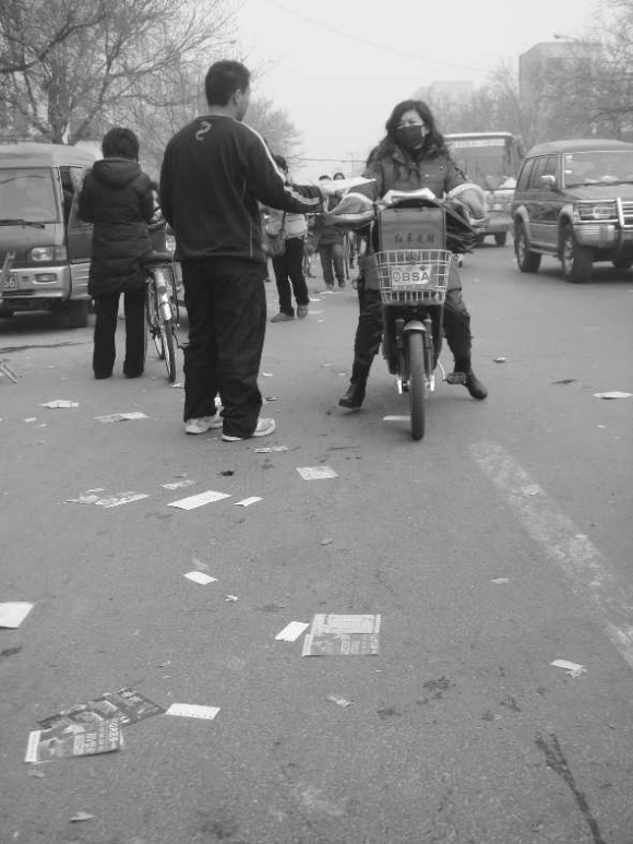 5日下午,在铁塔商场附近的利民路上,在100米的路段内有4个人发宣传单。市民大都接过传单后简单扫上一眼,就扔在路上。负责该路段的环卫工说,每个周末清扫出的废弃宣传单,能装满一垃圾车。 本报见习记者 罗宁 摄