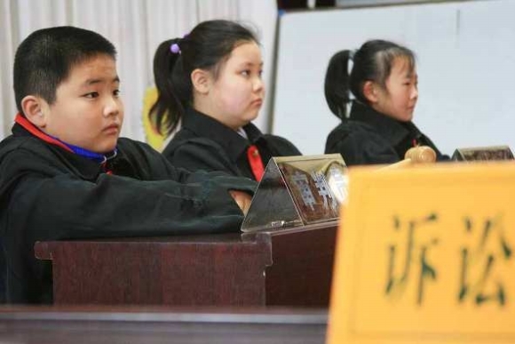 12月4日是全国法制宣传日,聊城大学“大学生法律援助中心”在东昌府区民主小学开展了“模拟法庭进校园”活动,小学生穿上“法袍”当上小法官,挥起“法锤”,从中学习法律知识。