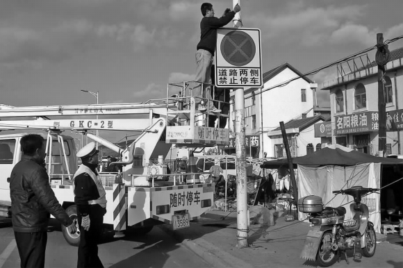 3日上午,在羊亭镇集市上,交警四大队组织安装禁停标志。长期以来,羊亭大集的经营者占道经营,车辆乱停乱放,时常导致20多米宽的302省道仅容一车单向通过。即日起,集市统一搬迁至302省道北侧路外,且道路两侧严禁停车。 本报记者 陶相银 摄