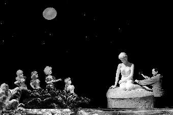 与传统木偶不同,这次演出的亮点在于全部采用大木偶。导演打破了木偶舞台的局限性,改变了以往传统木偶剧单纯的托举式遮挡表演的封闭形式,采用开放式的黑影戏方式舞台,首创了在同一场景表现海洋与陆地两个世界的美丽画面。从7日开始,上海木偶剧团在市区部分幼儿园开始巡演,10日至12日将集中在声远舞台连续演出6场。(图为木偶剧《海的女儿》表演现场,图片由上海木偶剧团提供)