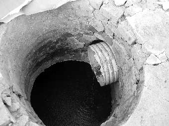 5日上午,记者在事发现场看到,从井口到水面约1.5米,水很浑浊,水面漂着很多杂物,附近的几个井口都装有井盖,只有这口井没有。