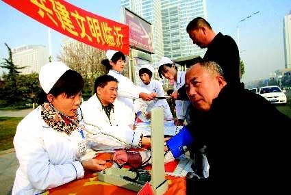 5日上午,在市区人民广场,临沂市第四人民医院的青年志愿者们在为市民免费做身体检查。当日是第25个国际志愿者日,临沂各部门纷纷组织志愿者走上街头奉献爱心,以形式多样的志愿服务活动宣传志愿精神。