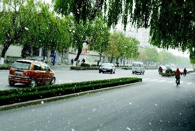 6日上午,烟台莱州文昌南路上雪花纷飞,这是入冬以来莱州的首场雪。本报记者 赵金阳 本报通讯员 陈 涛 周中杰 摄