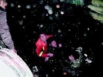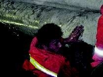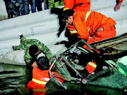 在确保车上堆积的电线杆不会松动的情况下,1名消防员迅速下水搜寻被困司机。由于水泥杆的冲撞和挤压,驾驶室已严重变形,同时天寒夜黑,也给搜救工作带来很大难度。经过努力,消防员找到了被困司机,并将其头部拉出水面,万幸的是,此时司机意识清醒。