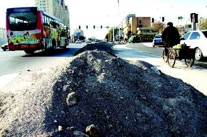 6日,在安顺路和胜利西街交叉路口北侧,路面堆积了近五十米长的水泥碎块,给过路车辆带来不便。据了解,前段时间该路段进行地下管道施工,而如今围挡撤了、路面铺平了,施工的水泥土堆却无人及时清理。