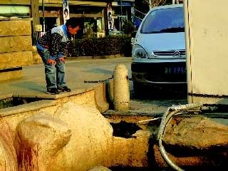 在东方巴黎步行街骏马广场,记者看到道路南边、人工湖旁边安装了一台纯水机。纯水机底下有两条白色的导管连着机器。记者留意到,其中一根导管通过广场人工湖通向地下,然而另外一根导管很短不到一米,尾部连着一根拇指粗的小细管,直接伸到湖面上方,管中“哗哗”不断向湖中流着水。