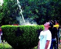 作品描述:一小伙子靠近绿色草雕大茶壶下的大“草茶杯”,仰天张口闭目,似乎在等着“绿茶”从天而降,送入其口。