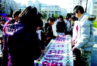 在第七餐厅前的主干道上,同学们来来往往,阳光爱心社的宣传板格外醒目。阳光爱心社的成员则积极走动,发放传单,倡导同学们关注残疾人事业,引导他们在横幅上签下名字。几支签字笔飞快地传递着,“你传递的不仅仅是笔,更是一颗颗爱心。”一位同学认真地说道。