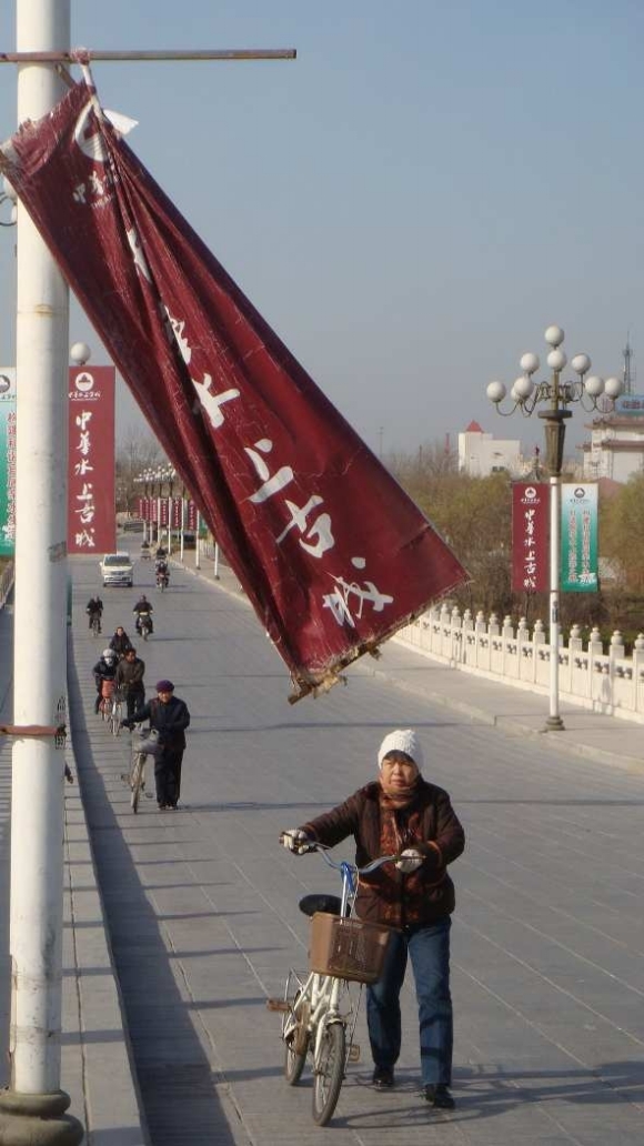 6日城区风力达到3-4级,西关桥桥面的一处路灯上铁支架的广告牌被吹得飘起来,铁支架“吱吱”地响,摇摇欲坠,市民路过时忙躲开。市政公用管理局的工作人员表示,7日上午会派人去维修。本报见习记者 罗宁 摄