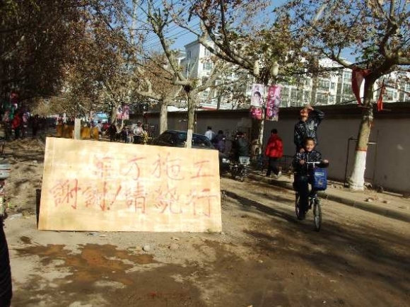 此外,为保证行人和车辆通行,他们先铺设了路西边一半路面,等干透后,再铺置另外的部分。由于路面较窄,行人在此经过,还是比较拥挤。图为已经铺好的一半路面前,已经设上“请绕行”的提醒。 见习记者 李璇 摄影报道