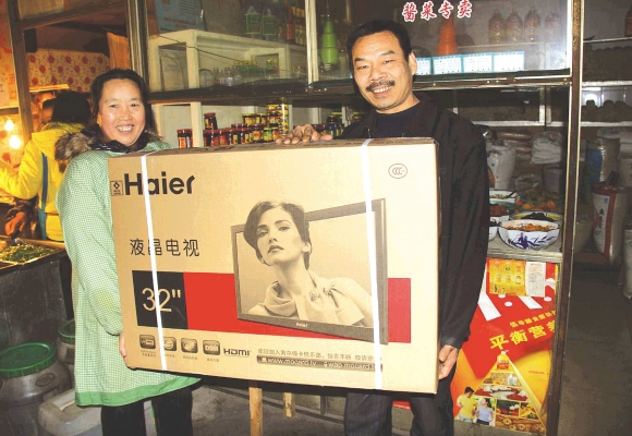 “订齐鲁晚报,中液晶电视”第一期各奖项抽出,王庄钢材市场的刘永兴和文化路农贸市场的毛金苓喜中液晶电视。6日,本报将大奖送到他们家中。图为幸运读者毛金苓(右)和妻子惊喜地抱着32寸液晶电视。