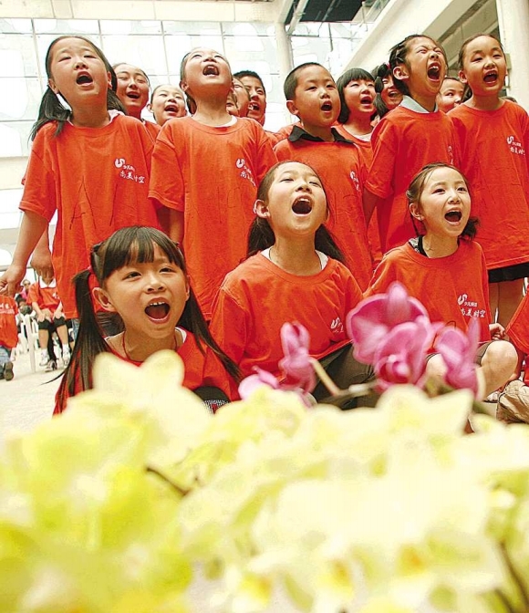 地点:花样年华景区;自述:六一儿童节,小朋友们在花丛前唱歌。