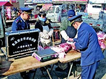 近日,在农村集贸市场,执法人员利用“食品安全快速检测箱”检测生鲜猪肉。目前正是禽肉价格上涨之际,为了防止制售注水、病死猪肉以及未检疫或检疫不合格猪肉的不法行为,禹城市工商局加大了对猪肉和禽类商品交易市场、农村集贸市场、小摊点和小经销点的监管力度。 本报通讯员 李吉华 本报记者杨金涛 摄影报道