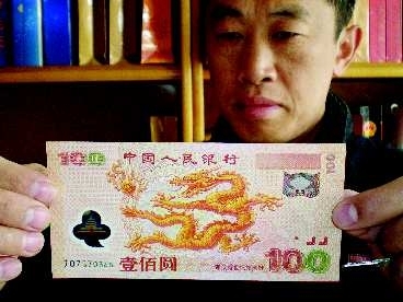 几年前,市民刘先生收藏了一张面值100元的“龙钞”,6日上午,记者在市民刘先生家中见到了这张较为罕见的钞票。据了解,该钞票是为了迎接新世纪,中国人民银行于2000年发行的100元纪念钞。正面图案是一条“金龙”,背面则是中华世纪坛,目前投资市场售价高达2000元左右。