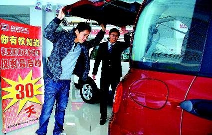 12月31日,实施近两年的汽车下乡补贴政策即将到期,许多有购车计划的消费者纷纷提前出手,抢占最后的商机。图为在市区鲁南汽车城,一市民正在选购汽车下乡补贴车型。 记者 马峰 刘海蒙 摄