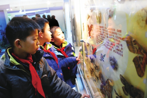 12月7日,小学生在湿地博物馆观看各种蝴蝶标本。当日,由本报组织的部分小学生随同来自全省的科普工作者参观了东营的三处社会科技馆和一处社会科普服务站。(详情见B02版) 本报见习记者任小杰 摄