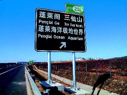 今年以来,烟台市旅游局协调财政局通过政府采购的途径向社会企业公开招标,经过严格的招标过程,烟台泰华路桥中标并进行优质高效的施工建设。通过现场的勘查定点,在全市的荣乌高速、深海高速、烟青一级路、滨海路、S264国辅烟汕线,为张裕酒文化博物馆、烟台山公园、养马岛旅游度假区、张裕国际葡萄酒城、金沙滩海滨公园、蓬莱阁、蓬莱极地海洋世界、蓬莱三仙山景区、南山旅游景区、牟氏庄园10家4A以上景区设立了指引标识牌。