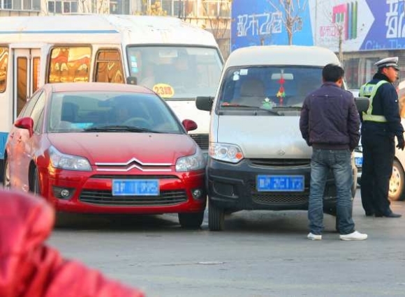 信号灯不亮,致交通混乱。图为:一辆面包车和一辆轿车撞在一起。