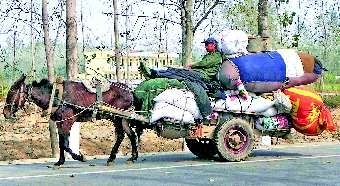 自述:赶车人悠闲地坐在高高的货物上驾车,但有一定危险性。