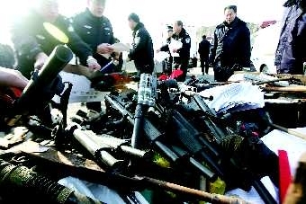 由于收缴的一些猎枪中还有未清理干净的火药,警方分两步销毁这些枪支、管制刀具,先浇上燃油进行焚烧,用大火引燃其中的弹药,以防发生意外爆炸伤人事故。当大火熄灭后,再将除去弹药的枪支投入炼钢炉熔化。
