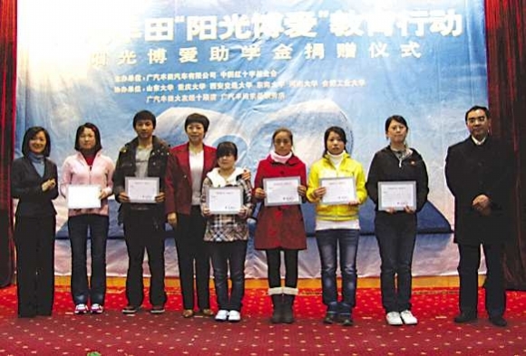 11月30日,广汽丰田2010年“阳光博爱助学金”捐赠仪式在山东大学隆重举行。在活动现场,广汽丰田向山东大学、西安交通大学、河南大学、东南大学、合肥工业大学、重庆大学6所高校共计捐款95万元。这些助学金将用来支付95位贫困大学生的学费,帮助他们顺利完成学业。据了解,广汽丰田捐赠“阳光博爱”助学金已经持续了4年,到目前为止,已为18所高校提供了330万元的助学金,解决了330名贫困大学生的“上学难”问题。 (宇轩)