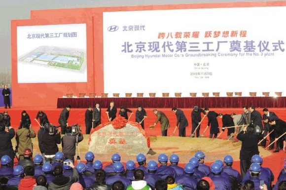 11月28日,北京现代规划已久的第三工厂奠基仪式在北京市顺义区杨镇隆重举行。北京市相关政府部门领导、北京汽车集团有限公司董事长徐和谊,北京现代相关人员莅临奠基现场。据悉,北京现代第三工厂预计2012年竣工投产,一期年生产能力将达到30万辆乘用车及20万台发动机,二期最终年生产能力将达到40万辆乘用车和40万台发动机。北京现代第三工厂的奠基昭示着北京现代将以更强大的制造体系为依托,在中国汽车产业发展道路上写下新的篇章。 (庆义)