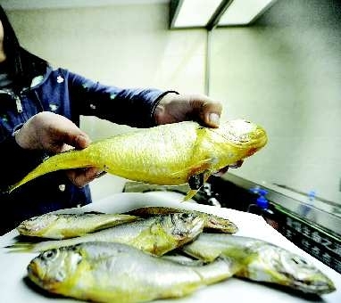 给黄花鱼“上装”成了鱼市上公开的秘密。由于深海野生黄花鱼颜色较黄,价格很贵,而浅海养殖黄花鱼颜色很淡,价格也低,为了冒充野生黄花鱼,不法鱼贩想出了用柠檬黄色素给鱼“上装”的歪招,坑骗消费者。因此,太黄的黄花鱼要慎买。本报记者王媛摄