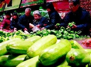 14日,济南一家超市内,身穿御寒服的市民在选购蔬菜。据工作人员介绍,这场寒潮没有造成蔬菜价格大涨,只有一少部分蔬菜调高了价格,大部分还保持原价没动。不过,按照惯例,随着气温进一步走低,菜价会逐步提高。