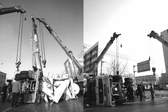 14日,在潍坊市新华路健康街路口南侧,一辆运送混凝土的罐车侧翻在地,车里的混凝土也流到了马路上。三辆吊车正在救援侧翻的罐车。据现场人员介绍,14日上午11点左右,罐车自南向北行驶,为了躲避一辆汽车,罐车驾驶员左打方向。罐车由于重心高,在躲避过程中侧翻在地。幸运的是,驾驶员只受了轻伤。