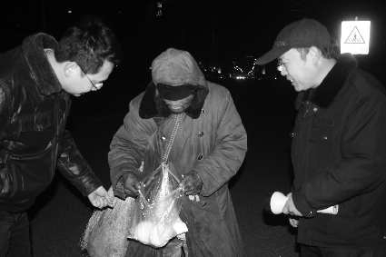 8点10分,在汽车总站附近,一名身穿军绿色大衣的拾荒者再次引起救助人员的注意。拾荒者大约60多岁,拿着一个白色的大包裹,他说,他叫王威,刚刚讨到一口热馒头,打算吃完东西就到车站附近睡一觉。