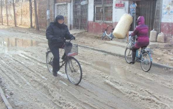 14日上午,市区园东街一处供水管道漏水,近百米的路面上冰水混合在一起,骑车的市民路过这里都要小心翼翼。