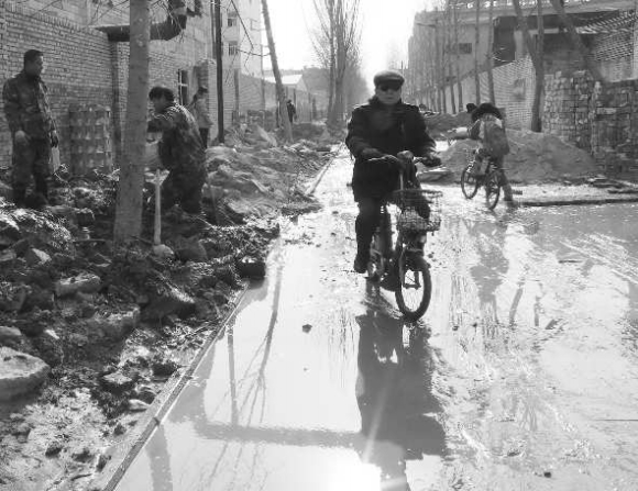 14日上午,园东街北段有近百米路面上淌满水,附近一处换热站正在建设施工,路中间有砖、土、水泥等。其中十几米路面结冰,被车辆轧得泥泞难行,有些路过的市民在路沿上推着车走过。正在抢修的聊城润达水业有限公司工作人员介绍,水是从一处供水管道流出来的,管道附近是在建的供暖换热站,估计是施工回填时没填好,又有车辆轧过,导致管道折裂漏水。