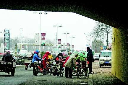 12月14日,在德州天衢路铁路桥下的一下坡路段,一菜贩把摊摆在了路上,不少市民驻足买菜。菜摊边上不断有车辆飞驰而过,让人为菜摊摊主和购菜市民捏了把冷汗。本报记者马志勇 摄影报道