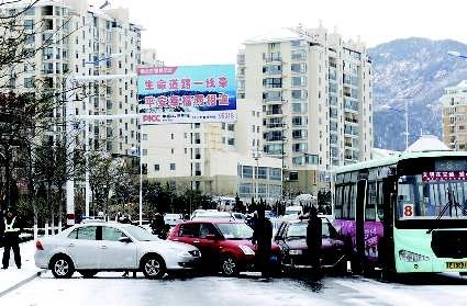 14日,在金沟寨附近,由于雪天路滑,五辆汽车发生连环相撞(左起第二辆车后方为第五辆事故车),横七竖八的汽车没给路面留下一点空间,在等待交警处理的过程中,过往车辆只能掉头绕 本报记者 郭建政 赵金阳 摄影报道