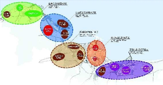 根据对烟台空港经济区腹地产业分析及其重点产业的选择,并结合现有产业情况,参考国际空港新城的开发经验及烟台空港的现实条件及需求,在核心区范围内,以空港为核心,划分六个产业片区。