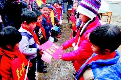 13日,烟台市青少年宫“爱心”格子店的13名小店主带着利用在青少年宫义卖旧书籍、旧玩具所积攒的4550.00元钱来到栖霞汉高希望小学,将手中“爱心捐助”的捐款亲自送到13名希望小学特困小学生的手中,还将自己准备的礼物也送给他们,礼物有书、本子、象棋等。