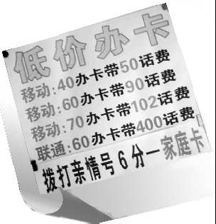 在大学城和海曲中路上,不少小店都开通了办理手机卡的业务,而超低的资费也的确让人动心。在大学城附近一家书店里,内含100元话费的联通手机卡45元就能买到,而同样话费的一款移动手机卡也只卖60元,买卡后还另外赠送400元话费。“不光卡便宜,打电话也很便宜,市话只需0.1元,长途都是0.25元,比在营业厅办卡划算多了。”记者注意到,这些小店销售的均是同一种手机卡,但售价却不尽相同。