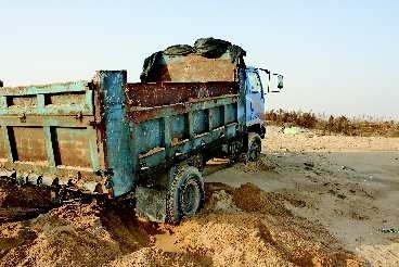 刚开始刘某只是用铁锨铲沙,然后用一辆农用三轮车拉,一辆车只能拉3吨左右,然后卖给附近存海货的商户。怕公安发现,他白天在工地打工,晚上12点以后才敢去海滩偷海沙,每天晚上差不多能装4—5车。